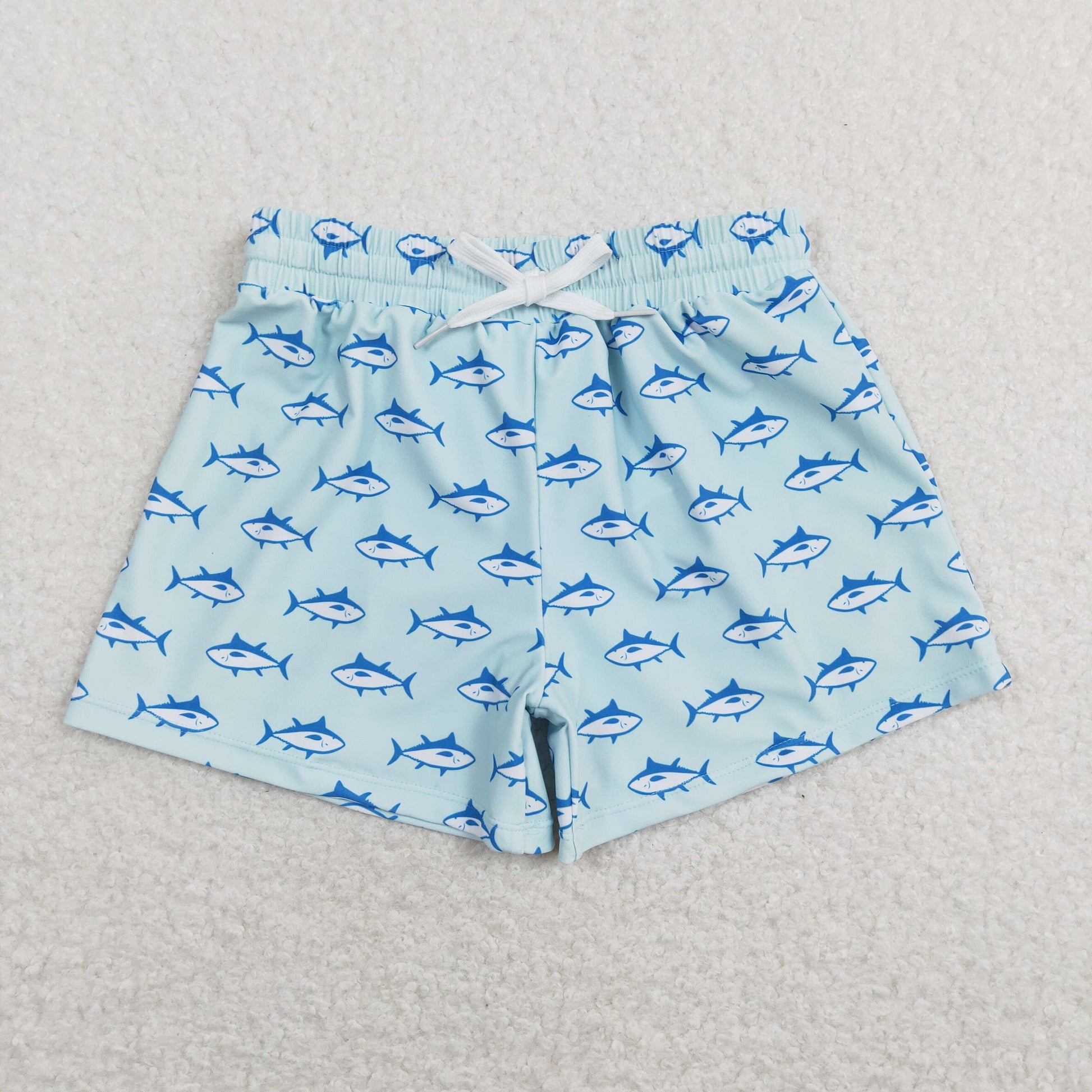 Classic and comfortable boys swim trunks featuring a fun blue fish print. Designed with a stretchy elastic waistband and adjustable drawstring for the perfect fit. Made from lightweight, quick-dry fabric with no uncomfortable inner liner, making them perfect for all-day beach and pool adventures.
